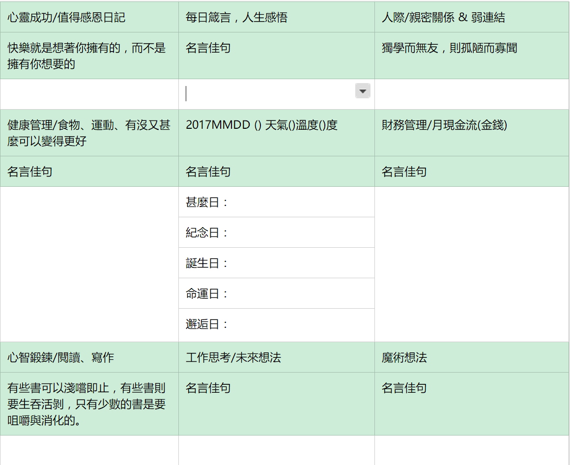 第二張圖是其中一格「閱讀/寫作」的內容,紀錄的方式我從過去的寫幾個字,改變成用作者提供的架構來書寫,這樣子最大的好處是,腦中的想法可以有一定寫作的方向,就想事回答問題一樣,我只要按照問題把自己心中的答案寫出來就好。